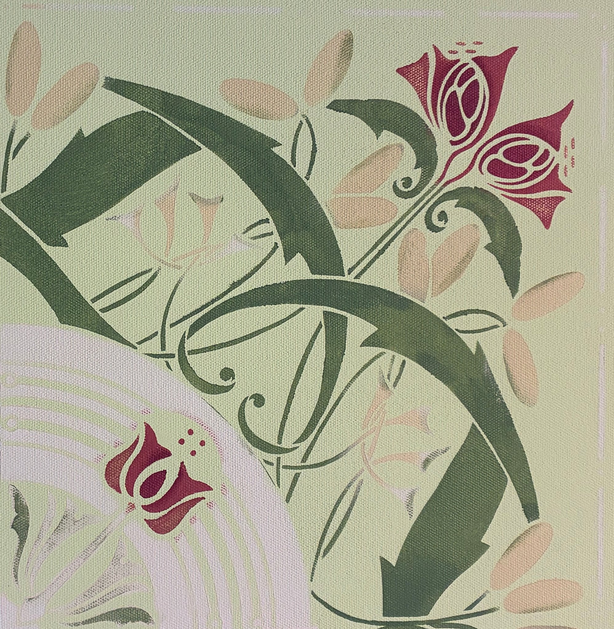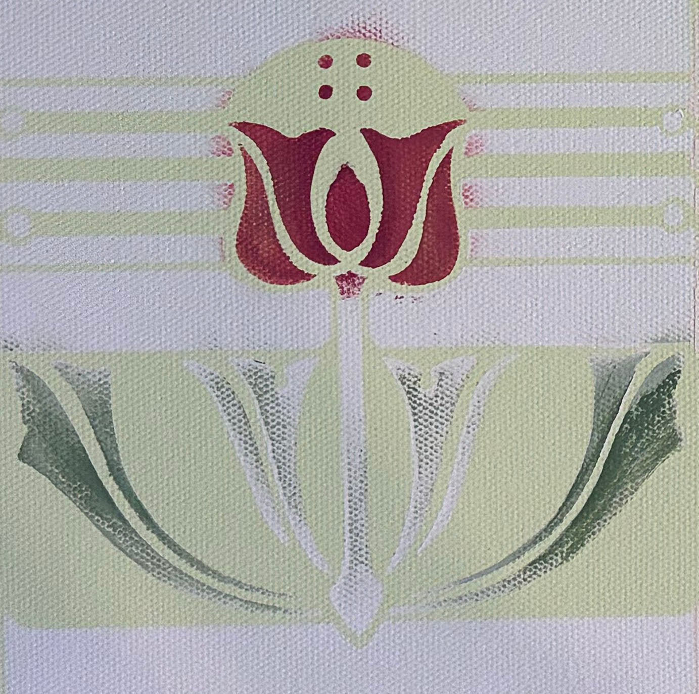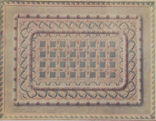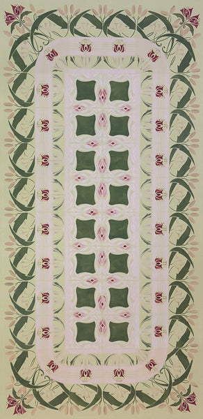 This pattern is based on a tin ceiling design from the Wunderlich Ceiling Company's 1912 catalog (the last photo is the design as shown in the catalog). Wunderlich was an Australian company that produced a fabulous array of tin ceiling designs, many of which are adaptable to rug design. The examples of floorcloths shown here always use the central element of the wonderfully misshapen squares and Art Nouveau floral design, and then all or some portion of the other elements, depending on the size and shape of the floorcloth.